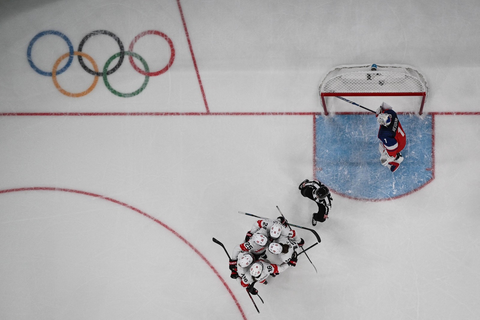 A atacante suíça número 25,Alina Muller,comemora com suas companheiras de equipe após marcar o segundo gol de sua equipe durante a partida da fase preliminar do Grupo A do hóquei no gelo feminino entre República Tcheca e Suíça,em 6 de fevereiro de 2026. — Foto: Wikus de WET / AFP