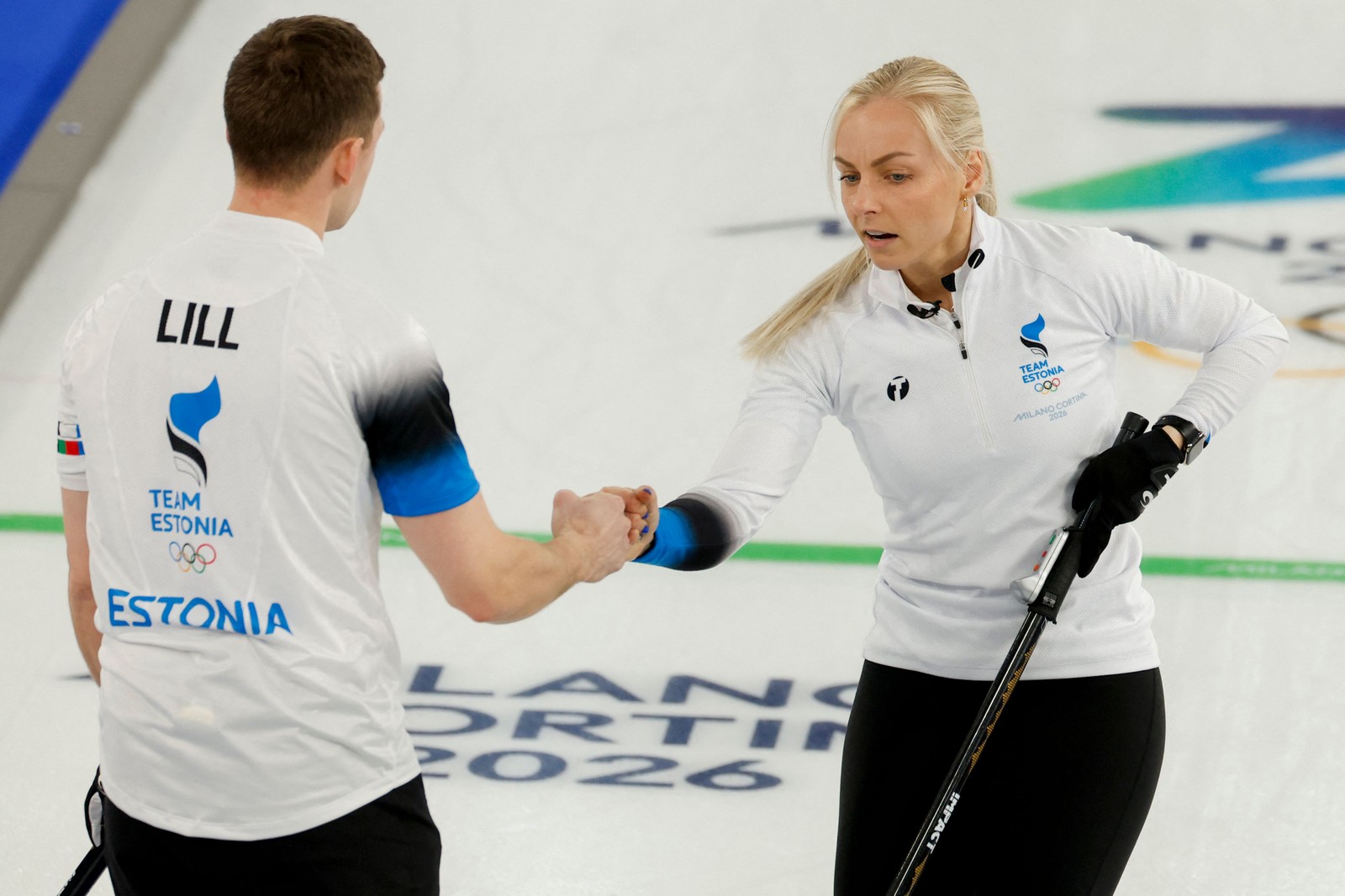 Harri Lill (E) e Marie Kaldvee (D),da Estônia,cumprimentam-se com um toque de punhos durante a partida de curling de duplas mistas entre Itália e Estônia,em 6 de fevereiro de 2026. — Foto: Odd ANDERSEN / AFP