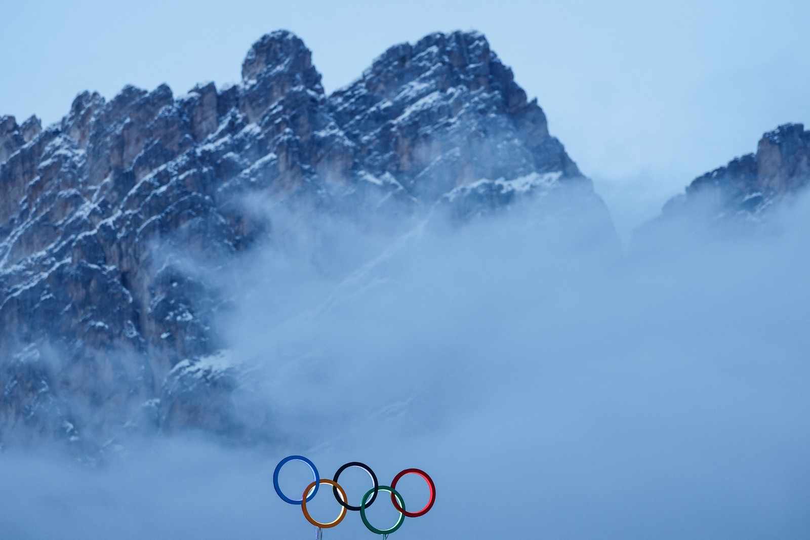 Os anéis olímpicos são vistos em meio à neblina e a uma montanha,em 6 de fevereiro de 2026. — Foto: Odd ANDERSEN / AFP