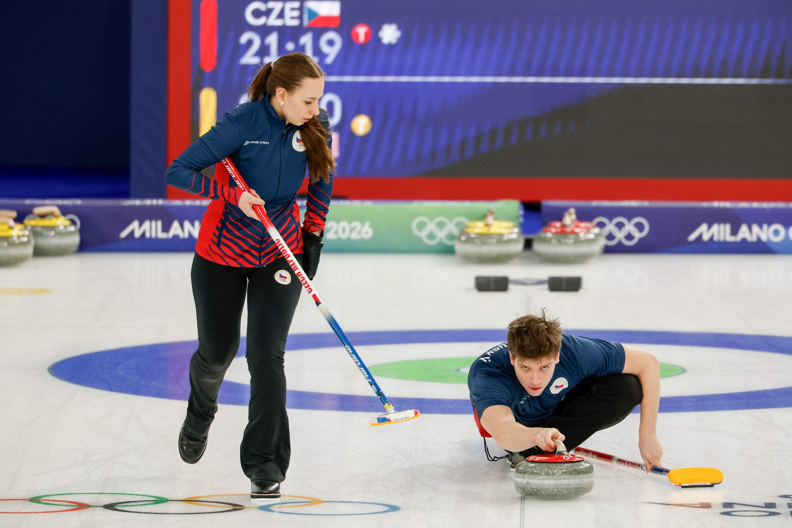O checo Vit Chabicovsky (à direita) lança a pedra enquanto a também checa Julie Zelingrova (à esquerda) se prepara para varrer a pedra no torneio de duplas mistas de curling entre República Checa e Estados Unidos,durante os Jogos Olímpicos de Inverno de Milão-Cortina 2026,em 6 de fevereiro de 2026. — Foto: Odd ANDERSEN / AFP