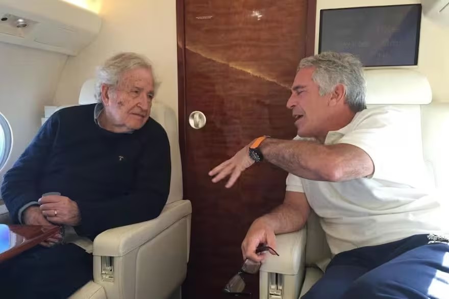 O autor Noam Chomsky e Jeffrey Epstein em jato particular — Foto: Reprodução