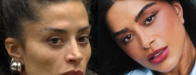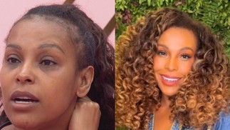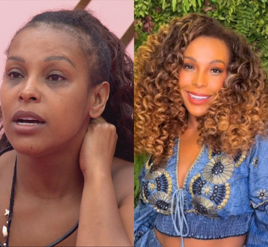 No 'BBB 26',Sol usava um aplique de rabo de cavalo. Agora,ela usa o cabelo mais solto e com mechas douradas — Foto: Reprodução/TV Globo e Reprodução/Instagram