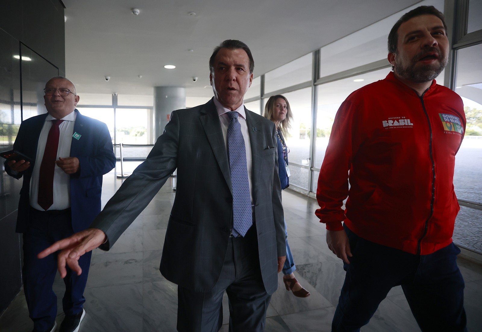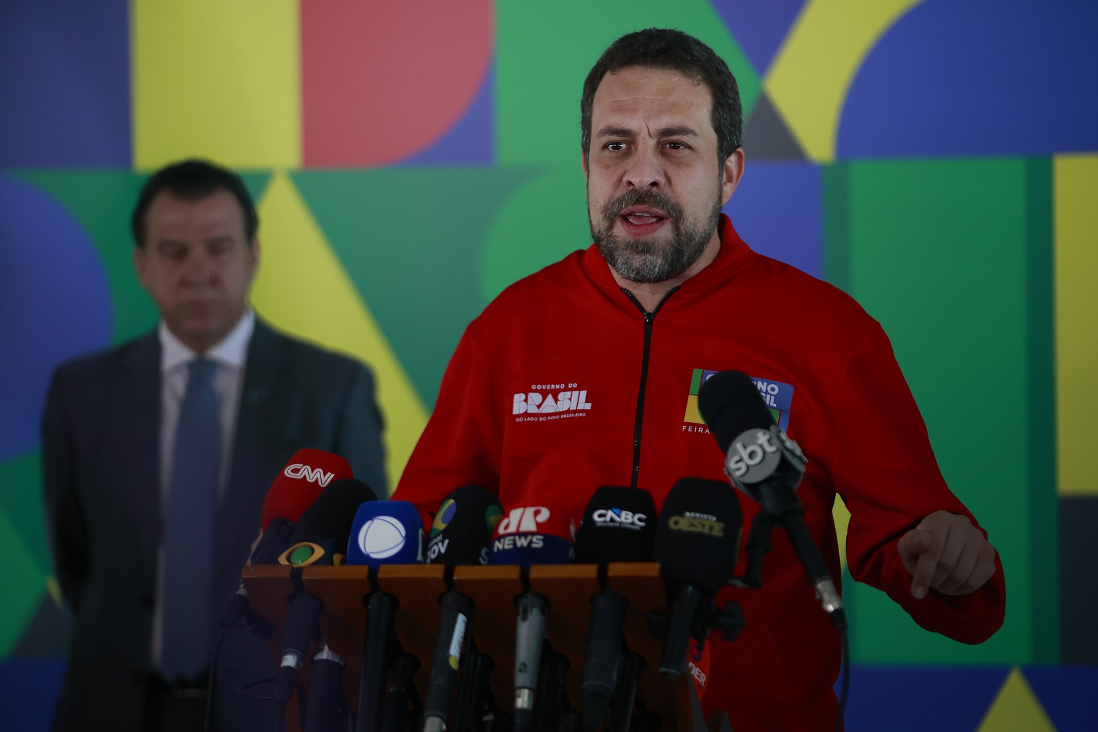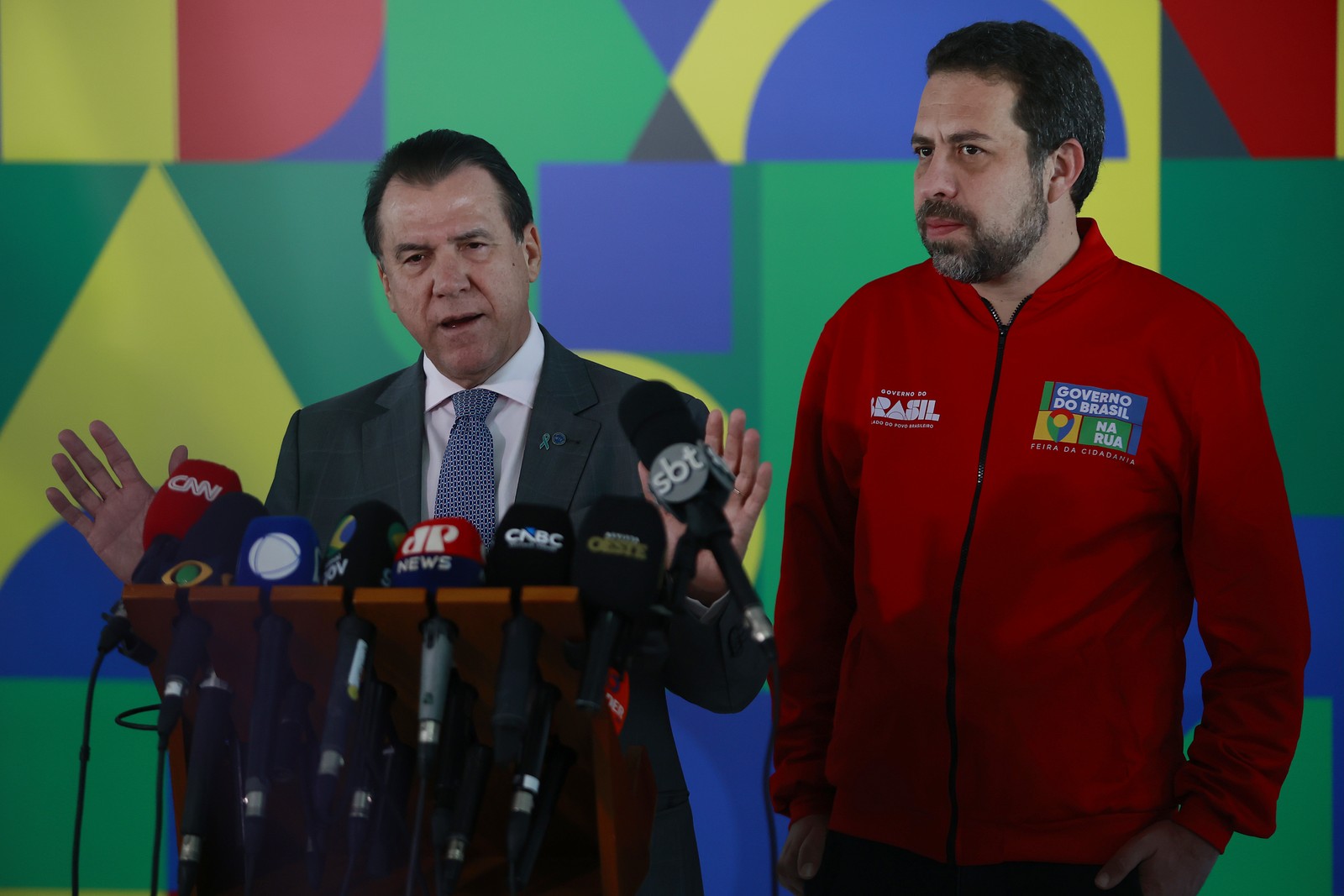 Ministros Luiz Marinho e Guilherme Boulos falam a respeito do projeto da Escala de trabalho 6x1,no Palácio do Planalto — Foto: Cristiano Mariz/Agência O Globo